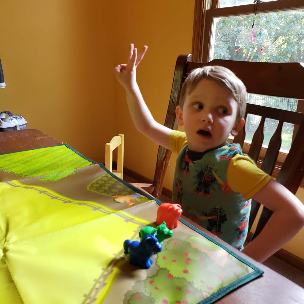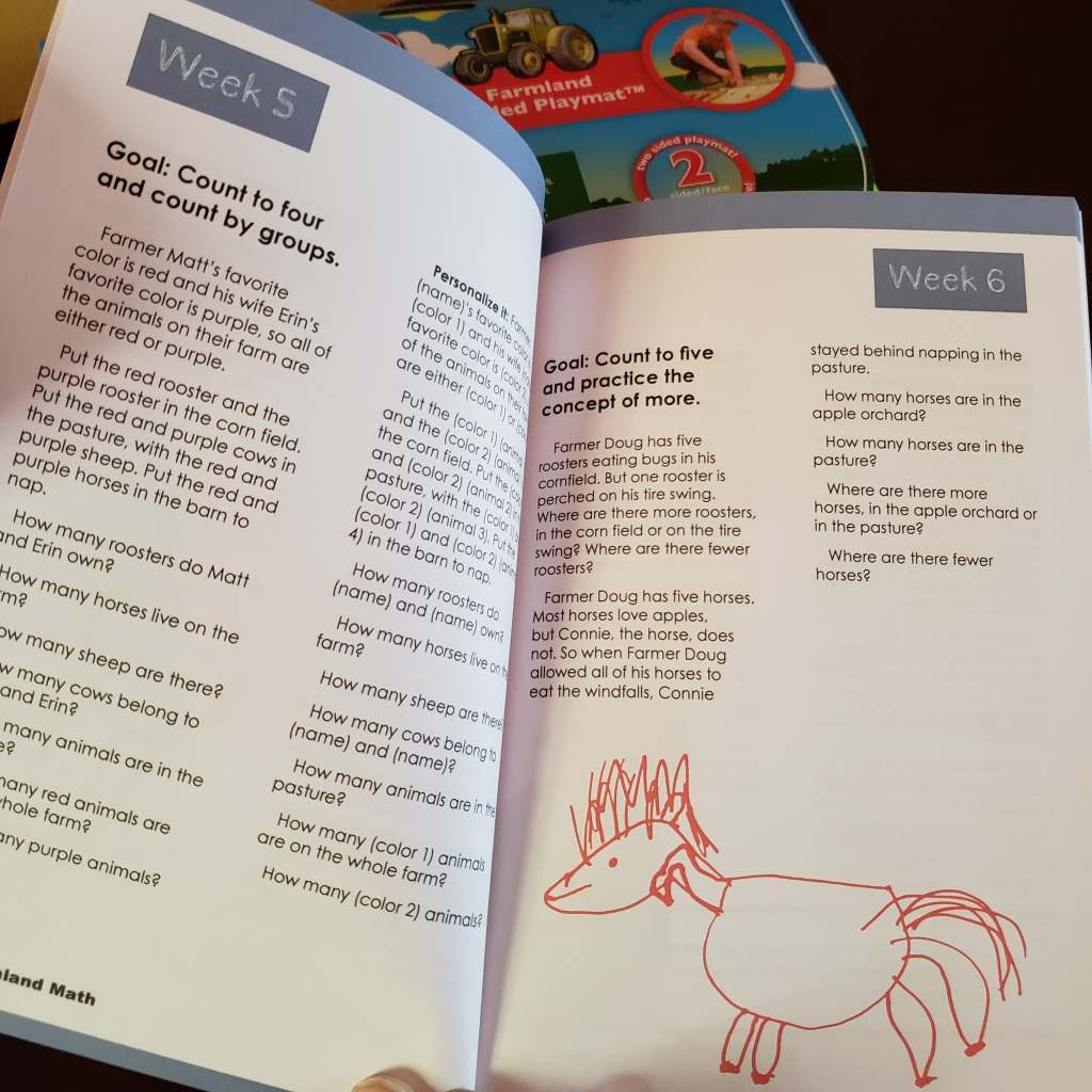 The book has a script for what the instructor can say to the student – this is great. Not only because you don’t have to come up with a script when you play with the farmland mat, but also because the script leads the student through mathematical thinking – from counting to grouping to basic adding and subtracting.
