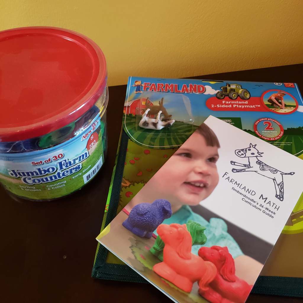 The Farmland Math Mat Bundle is a combination of resources. It’s a tub of counters, a large play mat, and then a guided manual that takes parents and students through 36 weeks of hands-on math activities. It’s suitable for ages 2+, but I reviewed it with my 3-year-old instead of my 2-year-old.