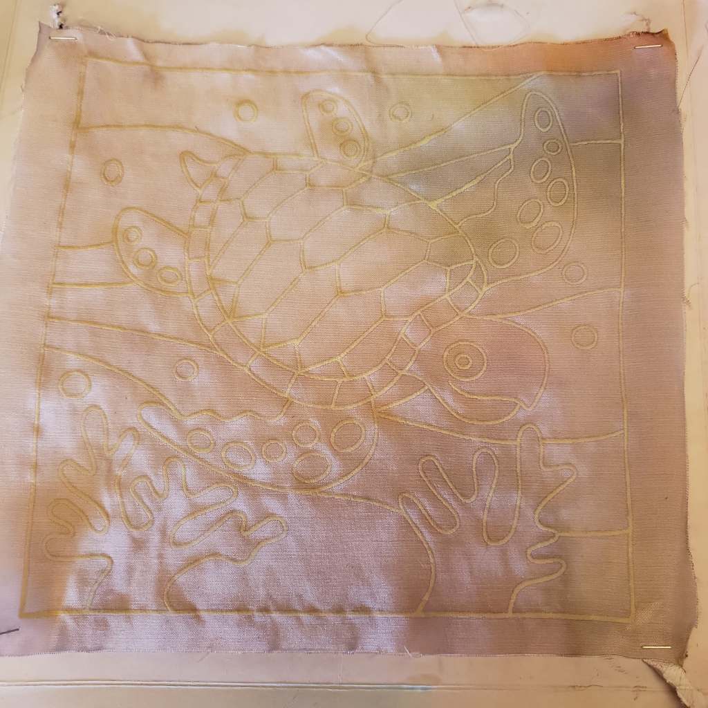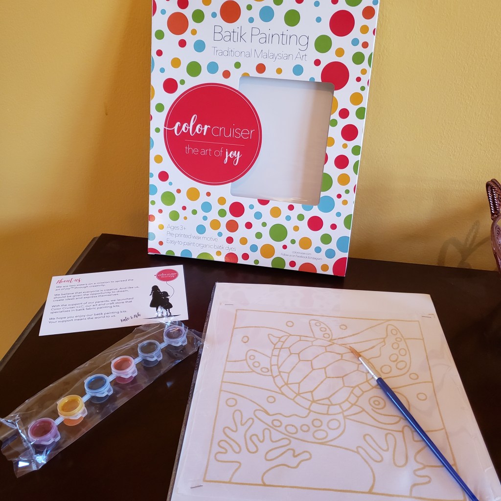 There are five options for the kit – Turtle, Seahorse, Fish, Macaw, and Hummingbird. We chose the Turtle. For $19.99, you get the fabric stapled to cardboard with the waxed design on it, paints, a paint brush, and the instructions.
