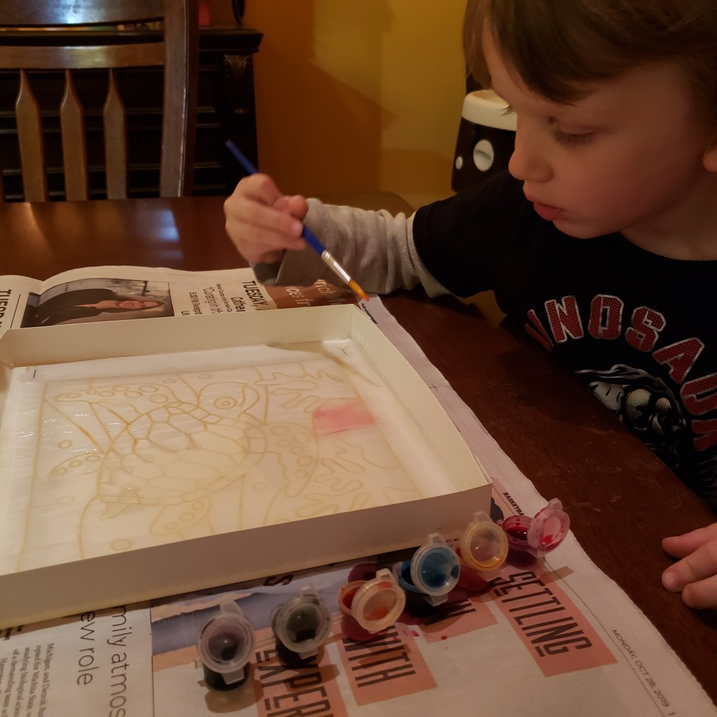 The paint was really vivid when he was putting it on – and the turtle looked gorgeous. I feel like we must have done something wrong, because when it dried, it dried so light! I was a bit bummed out about that – but we will try again.