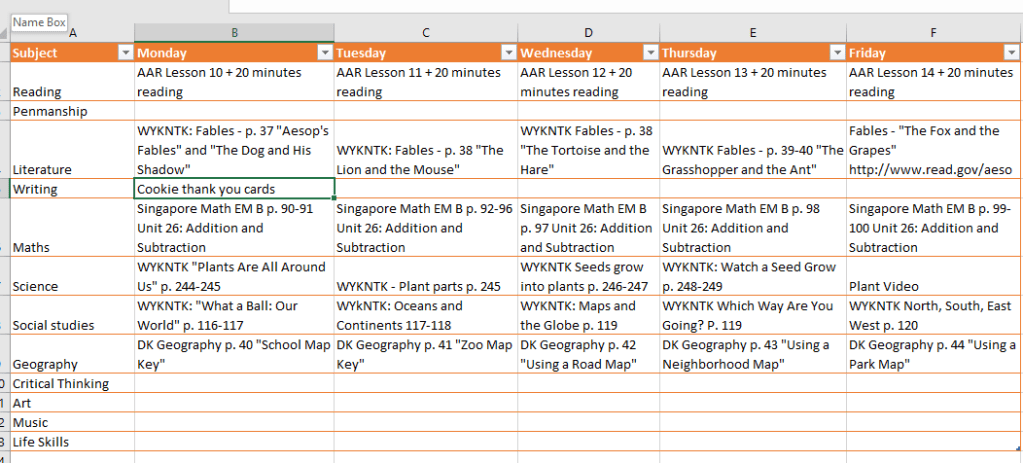 Right now, because we were thrown back into homeschooling, I’m using an Excel spredsheet just so I can get a general overview of the week. I’ll adjust as needed for the following week – for example, if I find it takes two days to complete a lesson in our reading curriculum, I’ll account for that (that’s one of the big reasons I like using the paper planner to record what we actually do). This allows me to see what supplies I’ll need for the week & plan accordingly. If our library were open, it would also allow me to make sure that on Sunday we pick up what books we’d need for the week as supplimental resources.