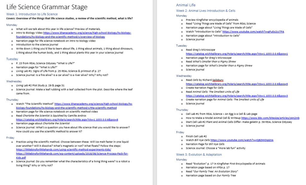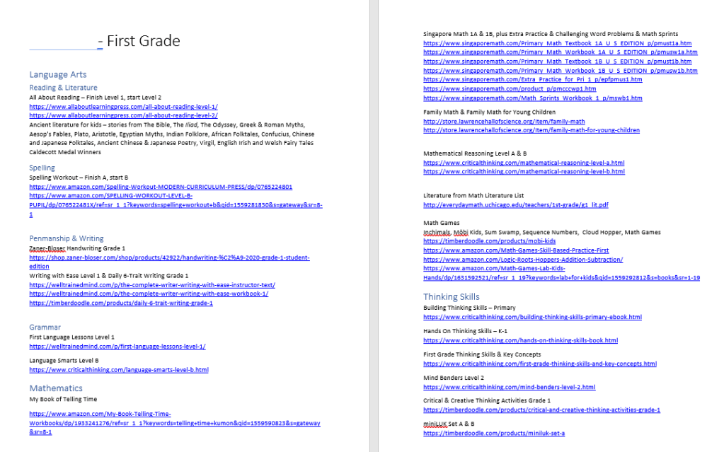 This is where I do my long-term planning and my brainstorming for curriculum ideas. In the above image, I have links to all the different resources. I’m not going to actually use all the resources listed, but I still like to go through, make notes of everything I’m interested in, and have it all in one spot. That way if one curriculum choice doesn’t work well or if I find we need extra help in an area, I don’t have to go searching. I can just go to my document, click on the link, and go to the page where I found the resource.