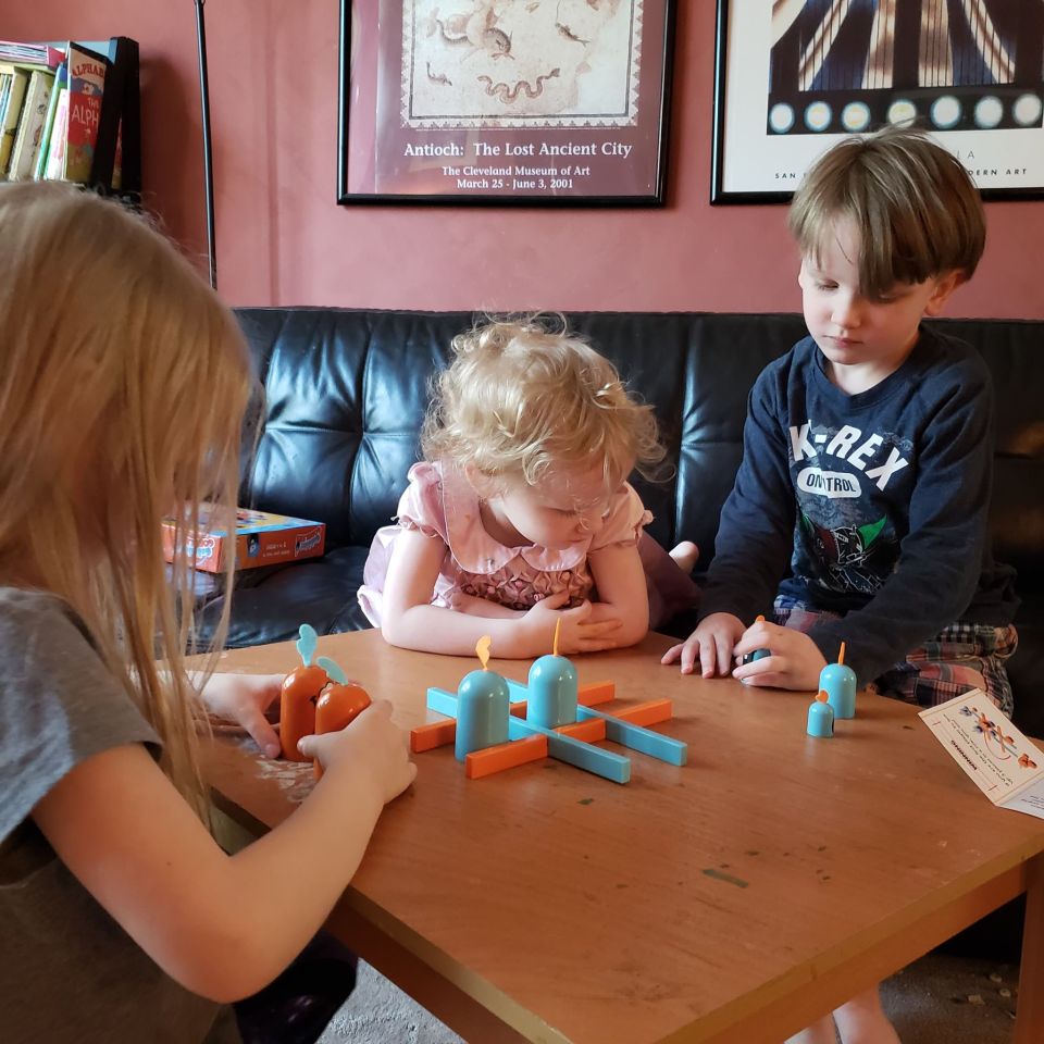 Miss 3 came along, and while she thought the game was cute, it was still just a little beyond her. We’re still working on taking turns and following game rules with her, so we’ll try it again in a couple of months.