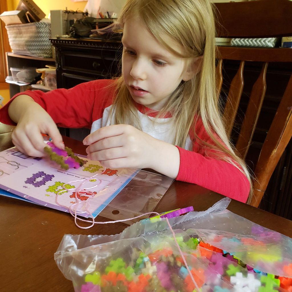 This kit is great not only for developing STEM skills, learning how to put things together, and following directions, but it’s also great for developing fine motor skills. Not only did she need to be able to interlock the pieces to build the pendants she made, but she also needed to be able to keep the pieces she’d already put together in place as she added the new ones.