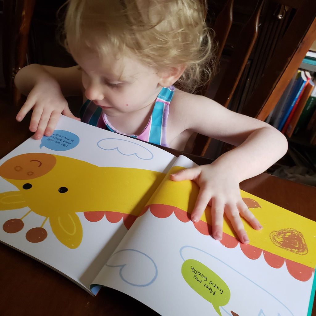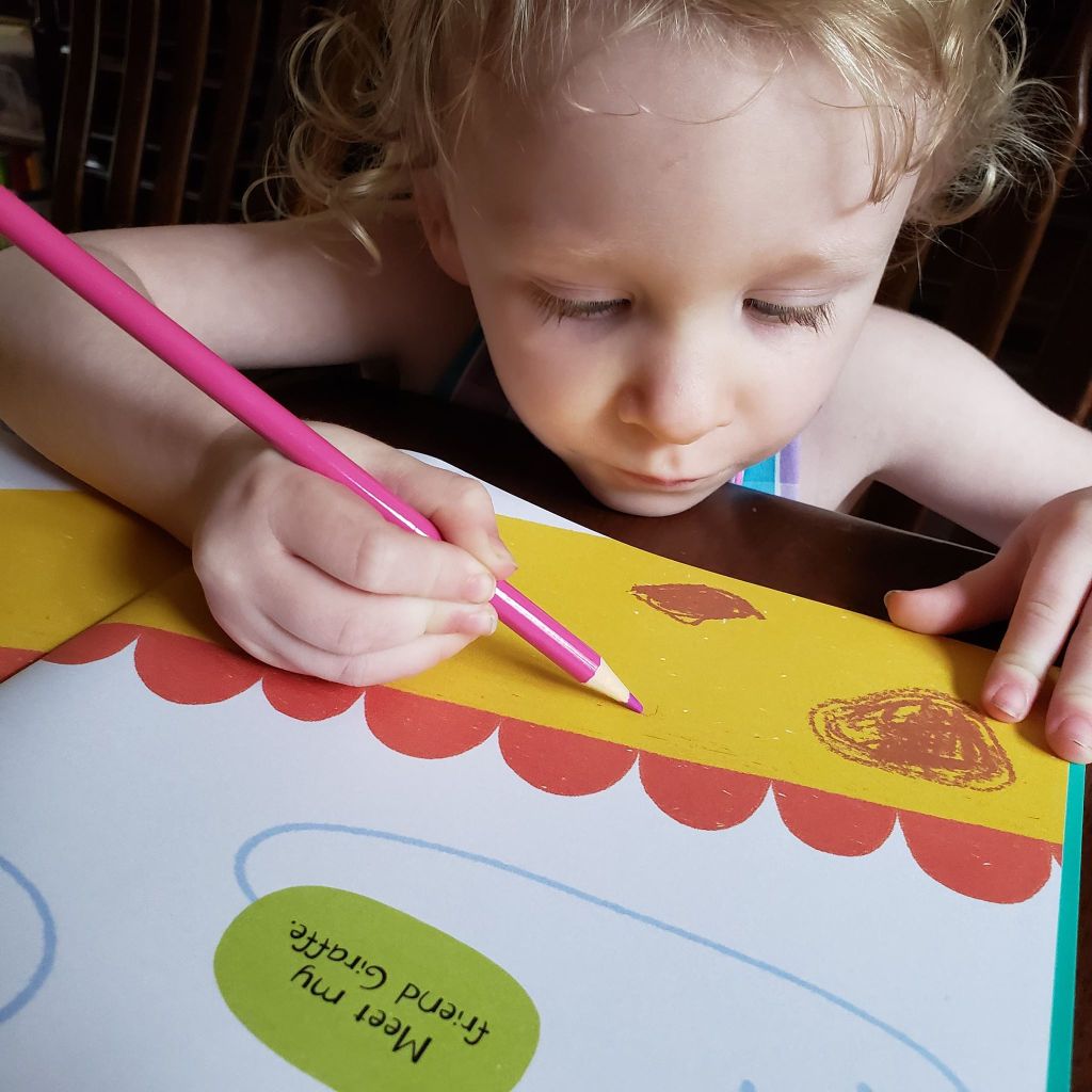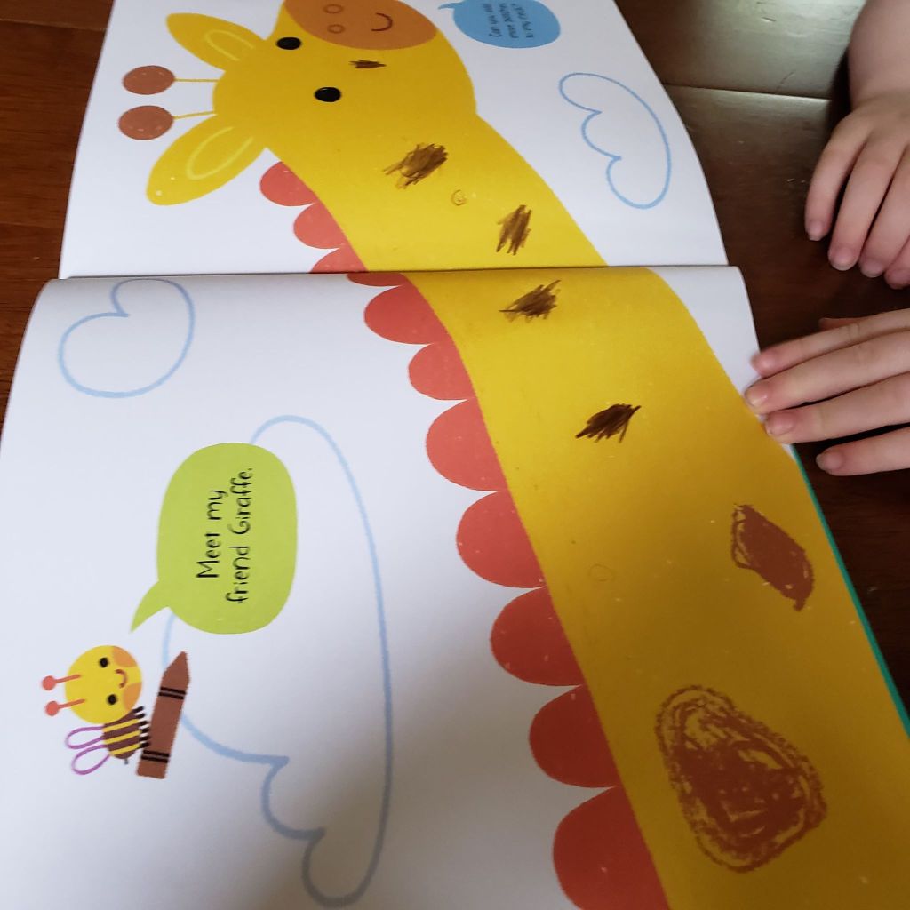 Little Miss Ladybug LOVED it. WE did two pages – the giraffe page (pictured) and a page with rainclouds (not pictured). Well, to be honest, SHE did two pages. I just read the directions for her.